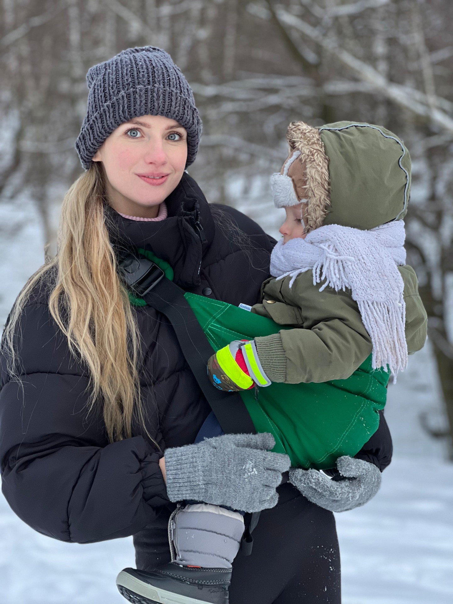 Gönnen Sie sich wunderschöne gemeinsame Momente voller Nähe und Geborgenheit mit der Bambeari Hüfttrage Forest Green.